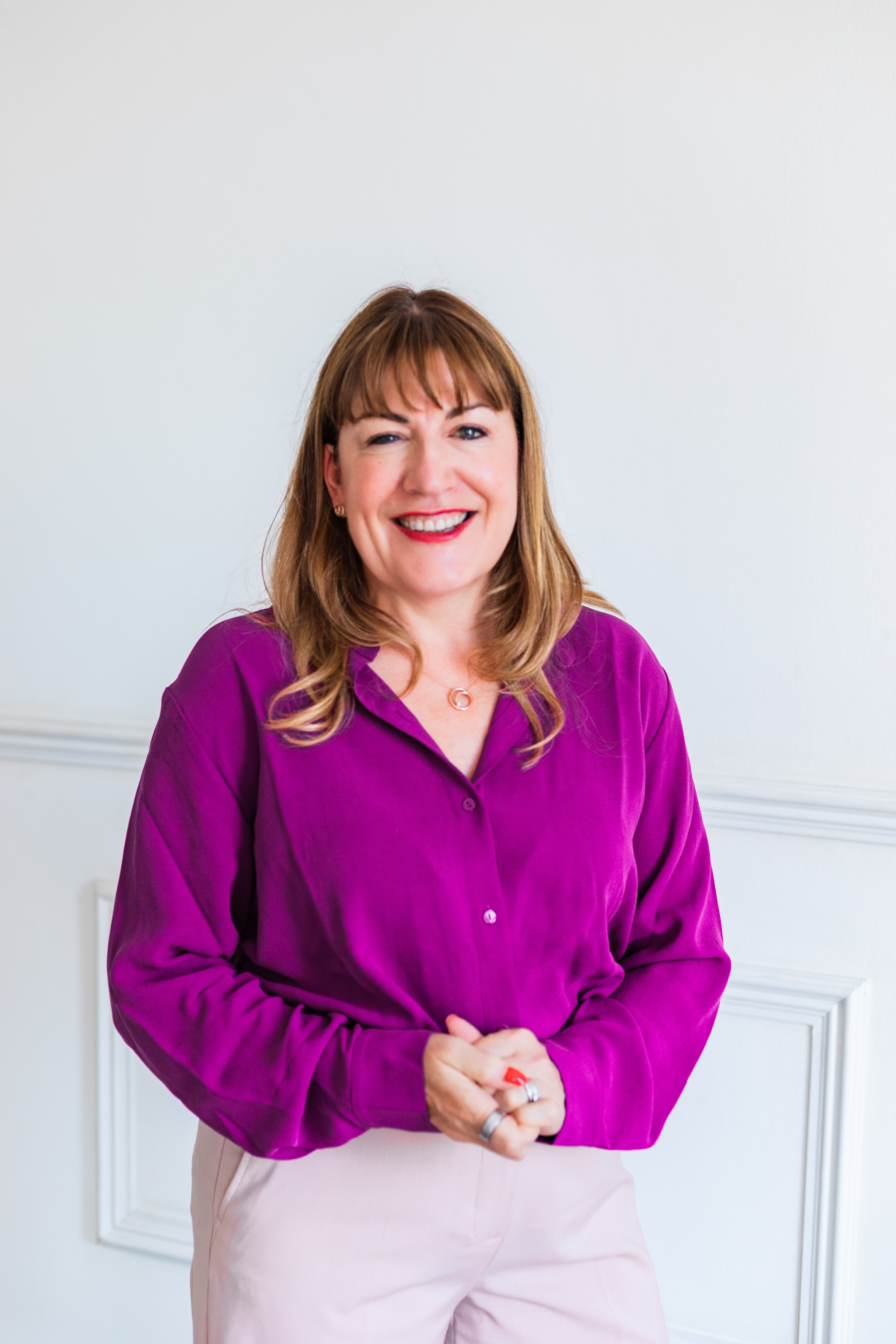 Antoinette Oglethorpe headshot, she has straight, light brown hair and a fringe is smiling at the camera. She is wearing a bright purple blouse and a necklace, standing against a plain white background.