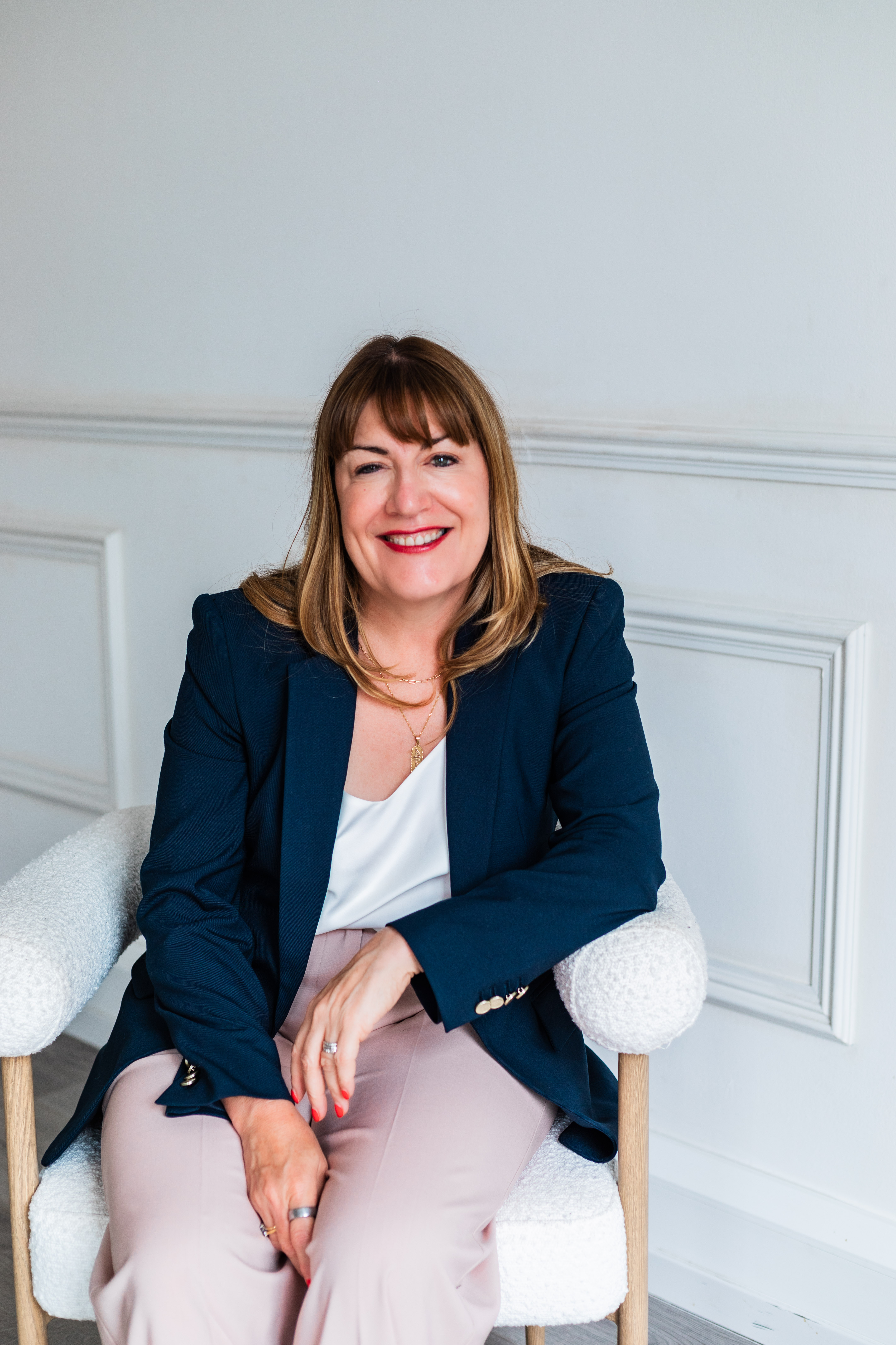 Antoinette Oglethorpe headshot, she has light brown hair and fringe, wearing a dark blazer and white top, smiles while sitting in a white chair against a light-coloured wall with decorative moulding.